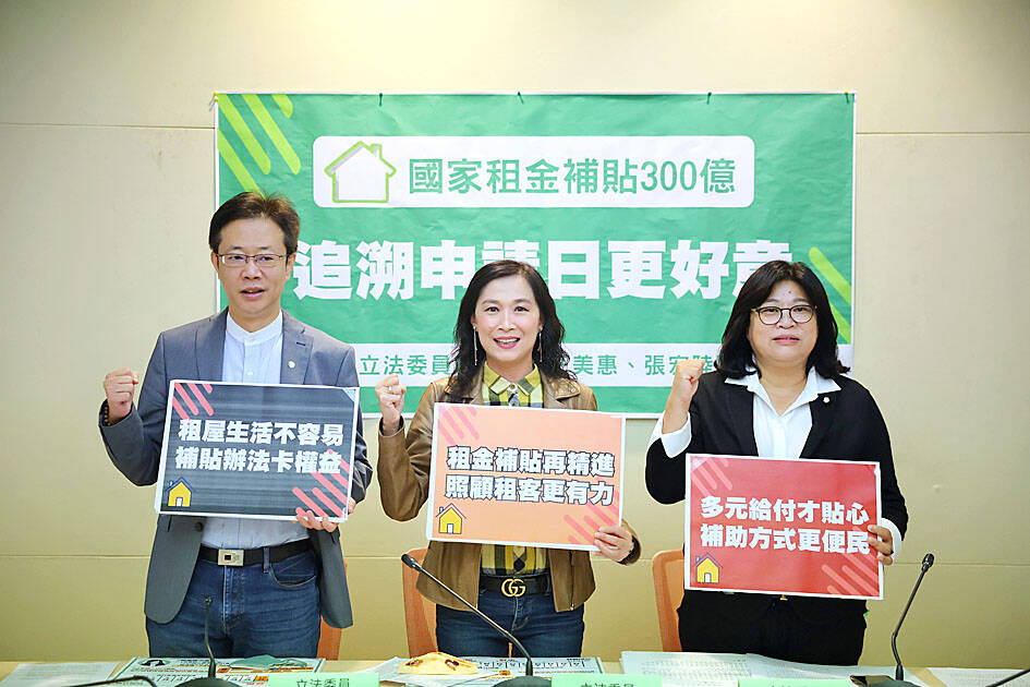 The government’s NT$30 billion (US$934.4 million) rent subsidy program is well-intentioned, but its effectiveness has been affected by red tape and an opaque real-estate market, DPP legislators Lin Yi-chin (林宜瑾), Wang Mei-hui (王美惠) and Chang Hung-lu (張宏陸) told a news conference at the legislature.