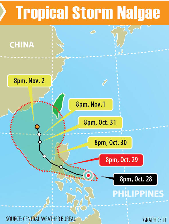 Tropical Storm Nalgae, approaching the Philippines from the east, could bring heavy rainfall to Taiwan’s northern and eastern areas as well as the Hengchun Peninsula from tomorrow to Wednesday, the Central Weather Bureau (CWB) said yesterday.