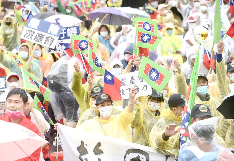 Members of the China Youth Corps protest on Ketagalan Boulevard in front of the Presidential Office Building in Taipei yesterday against what the organization criticized as the government’s “controversial ruling” on its assets. The group’s 61 properties and nearly NT$1.4 billion (US$43.6 million) in assets were nationalized after the Ill-gotten Party Assets Settlement Committee in July determined that it was affiliated with the Chinese Nationalist Party (KMT).