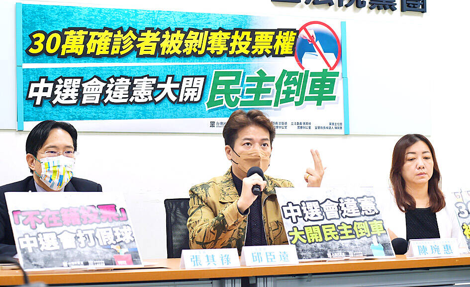 TPP caucus convener Chiu Chen-yuan (邱臣遠) told a news conference yesterday that the US allowed COVID-19 cases to be inside polling stations in the 2020 presidential election if they wore masks and kept a social distance of at least 1.8m.