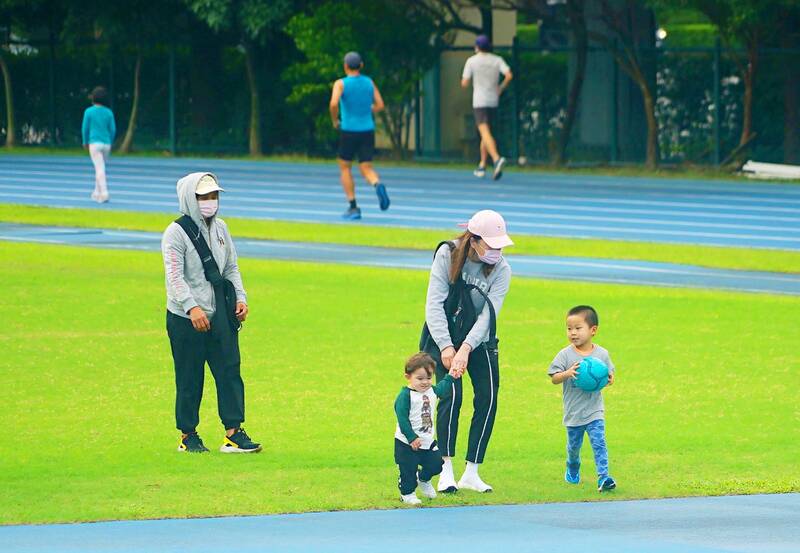 A woman walks with two children at a park in Taipei’s Songshan District yesterday. Forecasters said seasonal northeasterly winds brought temperatures down to about 20°C in parts of Taipei and surrounding areas over the weekend, but warmer weather is expected by Wednesday.