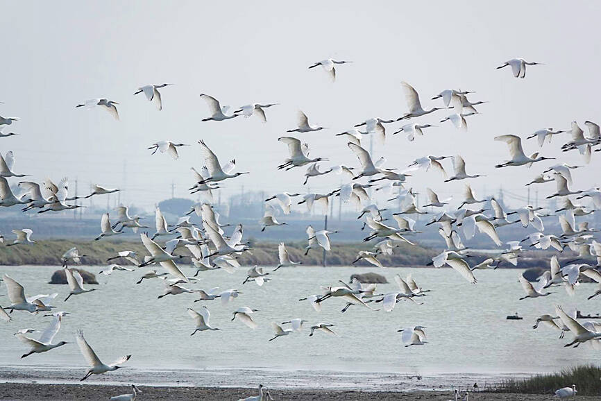Chiayi County Agriculture Department also reported an increase in spoonbill sightings amid a joint public-private initiative to feed the birds by diverting food-rich waters from local ponds to the wetlands off Budai Township (布袋).