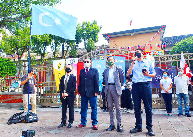 Members of the Taiwan East Turkestan Association and representatives from the Washington-based Uyghur Human Rights Project, along with Taiwanese civic groups, assembled in front of the Legislative Yuan and raised the national flag of the former republic while singing its anthem.