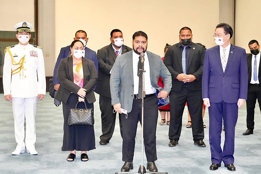 Nauruan President Russ Joseph Kun, front, second right, speaks to reporters at Taiwan Taoyuan International Airport yesterday after being welcomed by Minister of Foreign Affairs Joseph Wu, front, right. Kun is heading a 20-member delegation of Cabinet ministers and other officials on a six-day visit. President Tsai Ing-wen is scheduled to welcome Kun with a military salute today and a state banquet, Presidential Office spokesman Xavier Chang said yesterday.