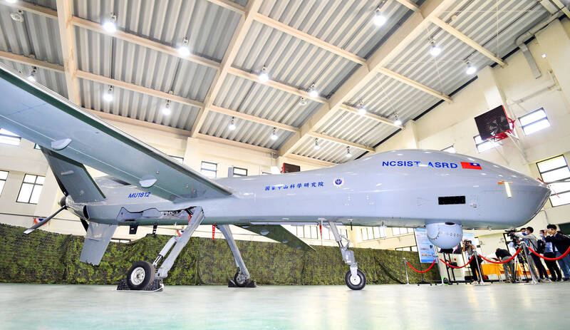 An anti-radiation suicide drone — which targets enemy radar by detecting its electromagnetic emissions — has a maximum flight time of five hours and can strike targets 1,000km away, with an ability to target seaborne, coastal and inland Chinese radar systems, said Chi Li-ping (齊立平), head of the Chungshan Institute of Science and Technology’s Aeronautical Systems Research Division.