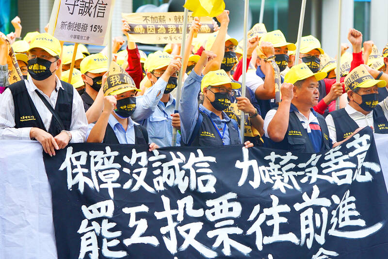 Members of the Chunghwa Telecom Workers’ Union protest outside the company’s headquarters in Taipei’s Zhongzheng District yesterday. They demanded that the company follow through with a salary raise that was promised last year, and increase wages to encourage employees, saying that otherwise they would go on strike.