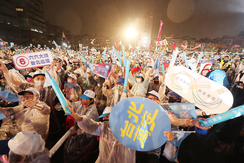 A rally for Legislator Chiang Wan-an (蔣萬安), the KMT’s candidate for Taipei mayor, at Taiwan Cement Corp’s Taipei plant was the biggest of the rallies, KMT Legislator Hung Meng-kai (洪孟楷) told a news conference in Taipei, adding that the party expected record-breaking attendance.