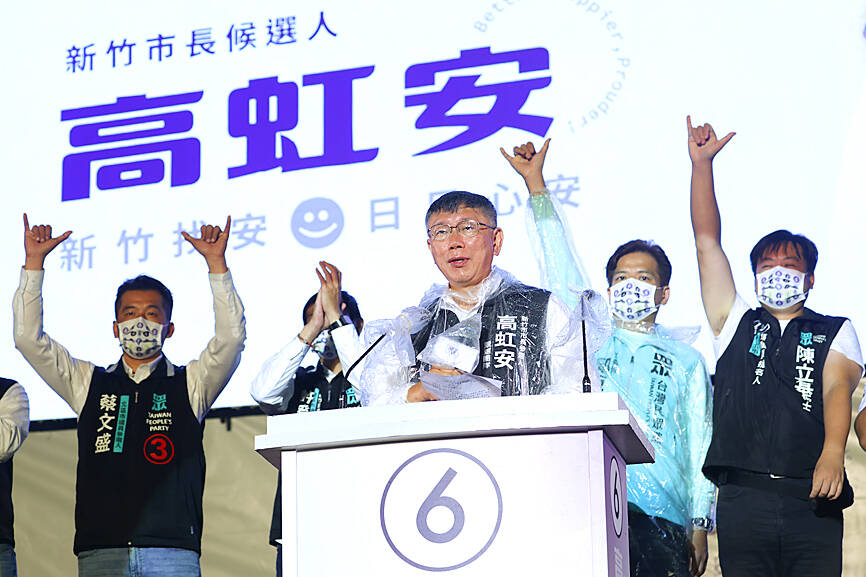 Ko yesterday also went to Hsinchu to support TPP mayoral candidate Ann Kao (高虹安) before heading back to Taipei to attend Huang’s final campaign rally on election eve.