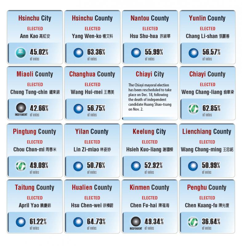 The Democratic Progressive Party (DPP) lost ground across Taiwan, with its biggest hopes dashed in Taipei, where the party hoped to reclaim the mayor’s seat for the first time since 1998, losing to the Chinese Nationalist Party (KMT). Hsinchu ousting a DPP mayor in favor of the upstart Taiwan People’s Party and Taichung voters re-electing a KMT mayor helped sour what President Tsai Ing-wen said would be a referendum on her leadership.