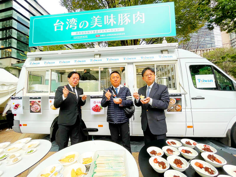Council of Agriculture officials pose in front of a Taiwanese pork food truck in Tokyo yesterday. The food truck is to be parked in Tokyo this weekend and in Yokohama on Dec. 17 and 18 to promote Taiwanese pork dishes, including sausages, braised pork rice and meatballs.