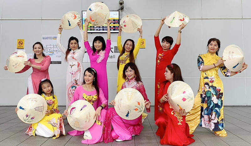 Members of the Taoyuan City Female New Immigrants Care Association pose for a photograph at Taoyuan Railway Station yesterday. The group performed a traditional Vietnamese dance to promote an International Migrants Day celebration that is to be held at the Taoyuan Women’s Center and the nearby Yanping Park on Saturday, featuring local cuisines from several countries as well as cultural exhibitions.