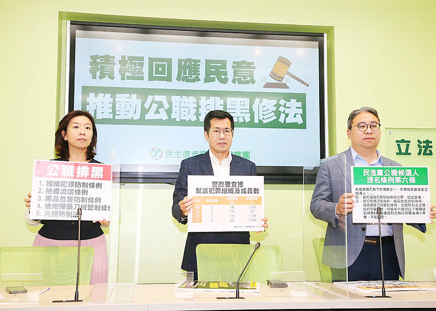 The Democratic Progressive Party (DPP) caucus yesterday said it would amend the Civil Servants Election and Recall Act (公職人員選舉罷免法) to disallow people with criminal convictions involving organized crime, money laundering, firearms or drugs from running in national or local elections.
