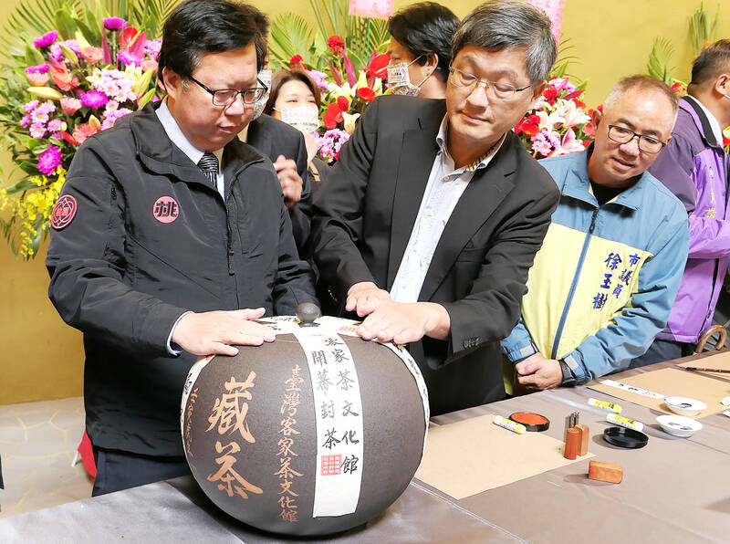 Taoyuan Mayor Cheng Wen-tsan, left, attends a tea-sealing event yesterday to mark the opening of the city’s Hakka Tea Culture Center.