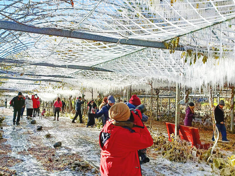 Visitors yesterday take pictures of icicles on the spray irrigation systems at Wuling Farm in Taichung, where temperatures dropped to minus-4.9°C between 6am and 7am.