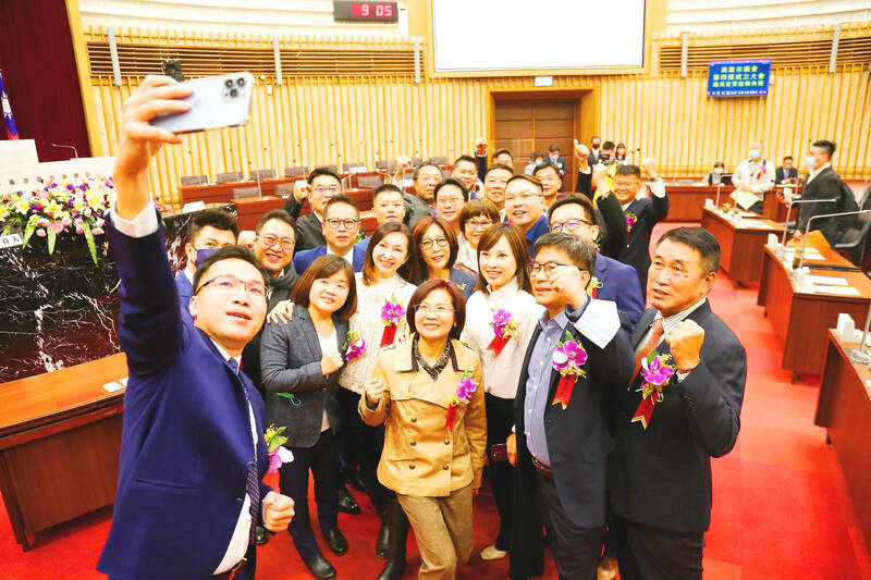 Newly sworn-in Kaohsiung city councilors pose for a selfie at Kaohsiung City Hall yesterday. The Chinese Nationalist Party (KMT) has secured 15 out of 22 local-government speakerships following the swearing-in of newly elected city and county councils yesterday.