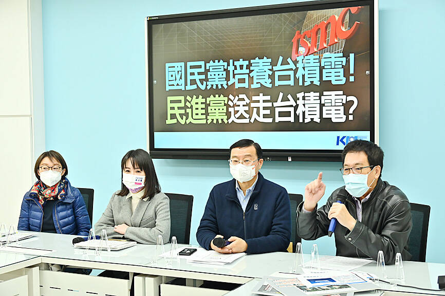 Chinese Nationalist Party (KMT) lawmakers on Monday accused the government of “ruining” Taiwan Semiconductor Manufacturing Co (TSMC) by “gifting” it to the US due to pressure from Washington, adding that the move would hollow out Taiwan’s economy.