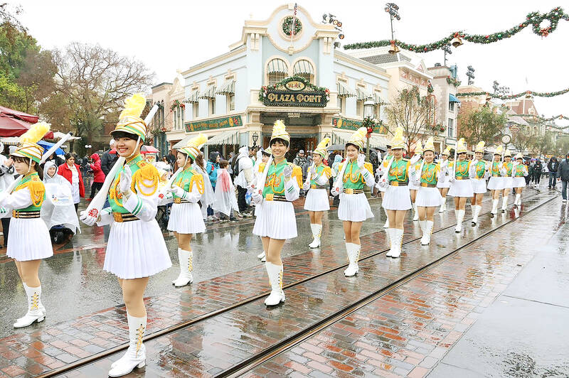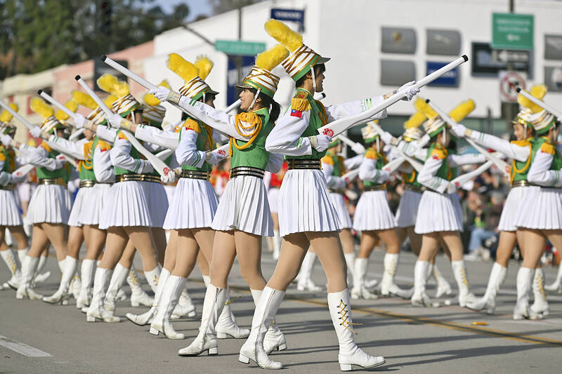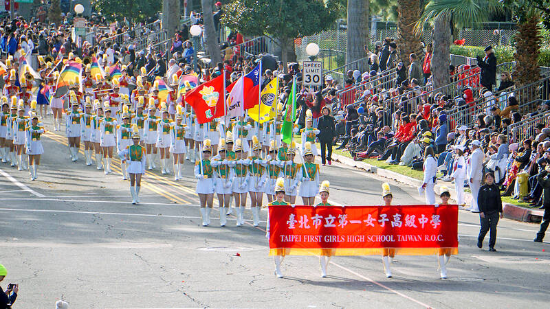 Braving low temperatures, members of Taipei First Girls’ High School’s (TFGHS) Marching Band, Honor Guard and Color Guard on Monday dazzled the tens of thousands of people lined up to watch the Rose Parade in Pasadena, California.