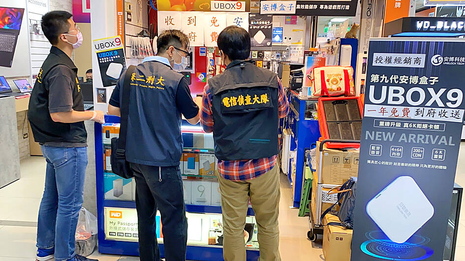 Police found that Unblock Tech boxes were distributed by Pro-Media Source Technology Co (圓陽科技), headed by a man surnamed Chen (陳), through its shop at Guanghua Digital Plaza in Taipei, which had two employees, surnamed Cheng (鄭) and Lai (賴), prosecutors said.