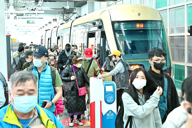 Passengers exit an Ankeng light rail train in New Taipei City’s Sindian District on its inaugural day yesterday. Passengers can ride for free between 10am and 6pm until March 12, after which it is to operate from 6am to midnight and cost NT$20 or NT$25 depending on the distance.