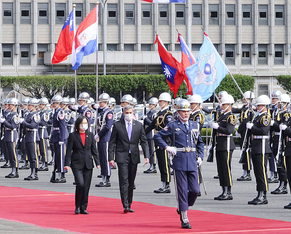 President Tsai Ing-wen (蔡英文) welcomed Abdo Benitez and his wife, Silvana Lopez Moreira, with a military salute in front of the Presidential Office Building yesterday, on their first visit in four years, and the first state visit since Abdo took office in 2018.