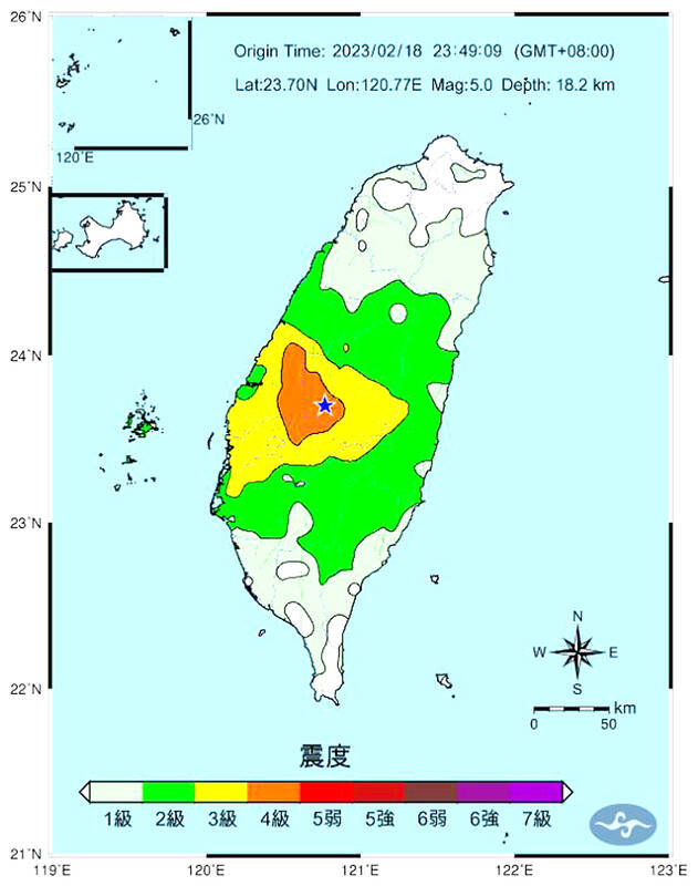 The quake’s epicenter was 23.4km southeast of the Nantou County Government Hall at a depth of 18.2km, bureau data showed.