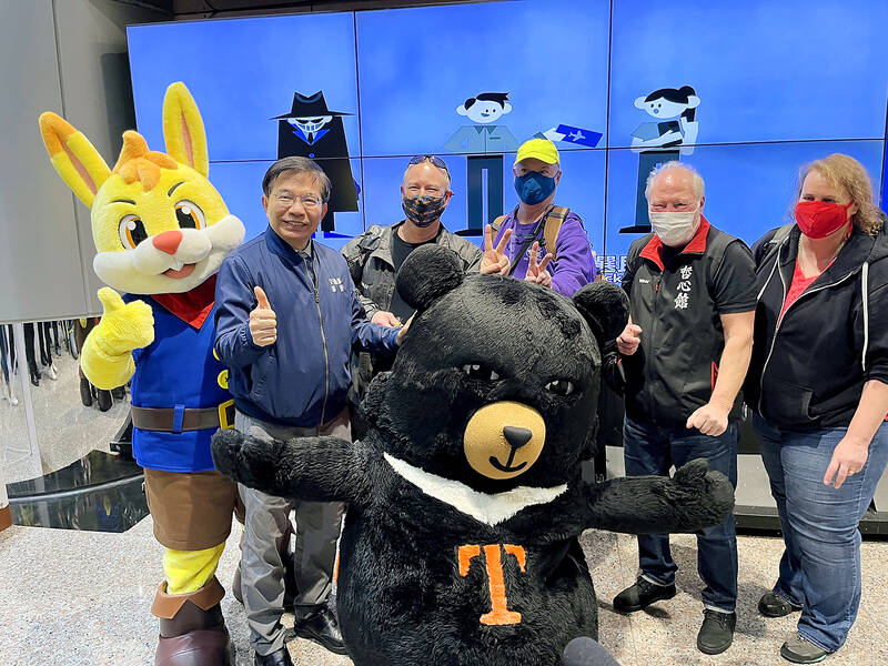 Minister of Transportation and Communications Wang Kwo-tsai, left, poses with Taiwan’s OhBear mascot and international travelers arriving at Taiwan Taoyuan International Airport yesterday. He also distributed chocolates to mark the 44th anniversary of the airport’s opening.