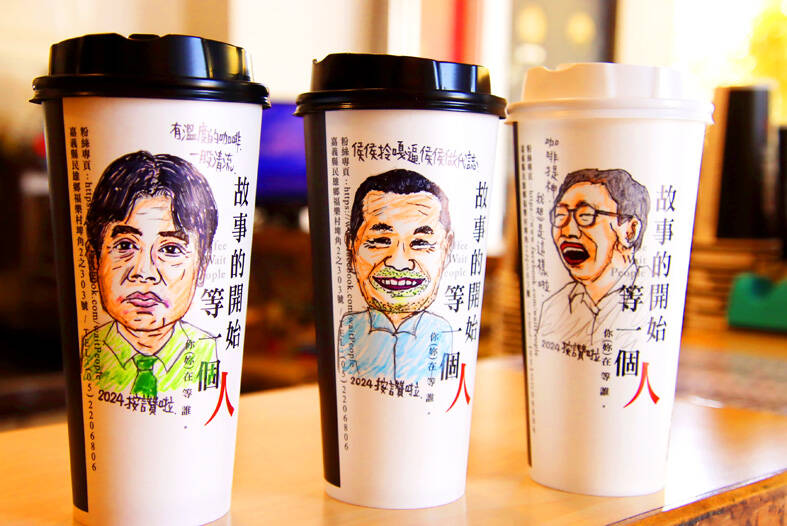 Coffee cups are a canvas for owner Kao Kuo-fang (高國方), who has been drawing portraits of his customers and famous figures for more than eight years.