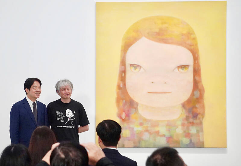 Japanese artist Yoshitomo Nara, right, and Vice President William Lai stand beside Nara’s painting “Hazy Humid Day” at the Neiwei Arts Center in Kaohsiung yesterday, the day before the opening of the free decade-long exhibition “Traveling with Hazy Humid Day.” Nara, who is on a 19-day residency at the center, gave a lecture yesterday, his second ever in Taiwan.