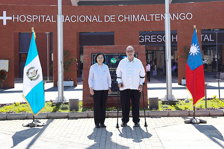 Taiwan’s and Guatemala’s national flags, as well as President Tsai Ing-wen’s (蔡英文) and Giammattei’s names, are engraved in a commemorative plaque at the hospital’s entrance.
