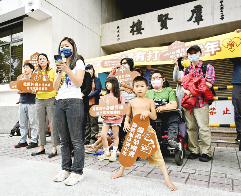 Several civic groups gathered in front of the Legislative Yuan in Taipei on Children’s Day yesterday to express their support for the Ministry of Justice’s proposed amendment to the Civil Code banning any form of parental discipline that inflicts “physical or mental violence.”