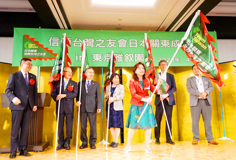 Physician Hsiao Li-li, third right, waving flag, attends the inauguration of the Kanto Area “Believe in Lai” Association in Tokyo yesterday with former Democratic Progressive Party chairman Cho Jung-tai, left. Hsiao, who lives in Japan, recently established the association in support of Vice President William Lai’s presidential bid.