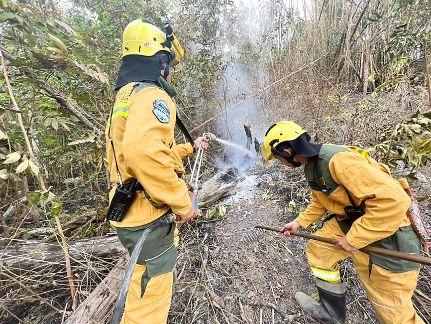 The blaze, which was first reported on Wednesday in an area near Gouping Road in Neimen District (內門), spread quickly to the surrounding forests in Shanlin District (杉林), the bureau said.