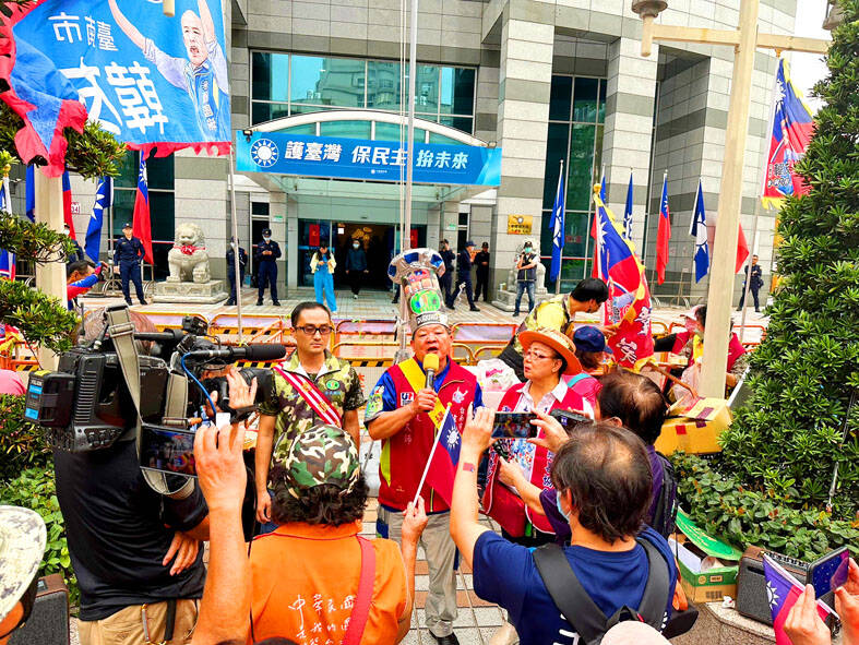 A small crowd gathered in front of the KMT headquarters in Taipei yesterday morning, led by Liao Sheng-fang (廖盛芳), chairman of the Tainan Han Supporters’ Association.