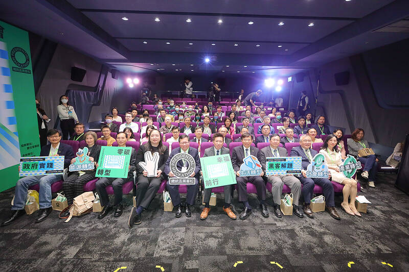 Officials including Minister of Digital Affairs Audrey Tang, front row fourth left, yesterday attend an event in Taipei marking the opening of applications to join this year’s Presidential Hackathon. The theme is net zero transition, with teams required to develop creative solutions to problems of sustainability using technology and open data. Applications are open until May 31.