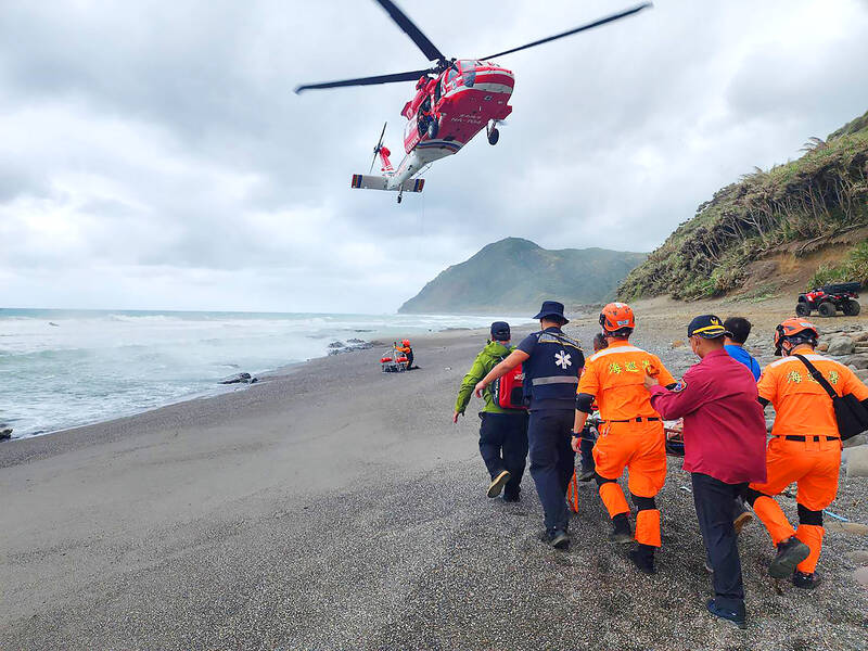 A rescue helicopter hovers above a beach in Pingtung County’s Mudan Township yesterday as emergency personnel carry the body of a woman toward it. The woman, who had collapsed on the beach due to a heart condition, had no vital signs when rescuers arrived.