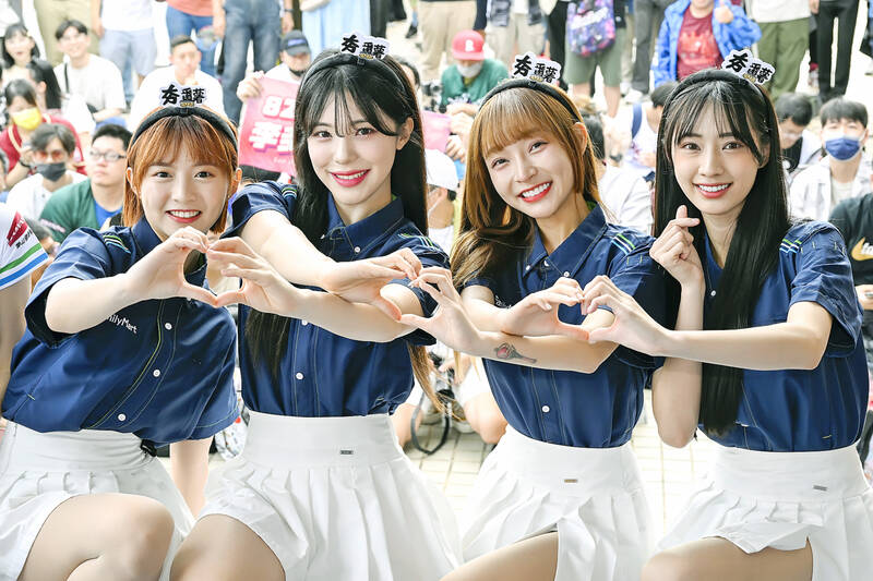 Rakuten Monkeys cheerleaders including Mizuki Lin, second right, and Lee Da-hye from South Korea, second left, pose for a picture at Taoyuan International Baseball Stadium at a game between Taiwanese professional baseball teams the Rakuten Monkeys and the Wei Chuan Dragons.