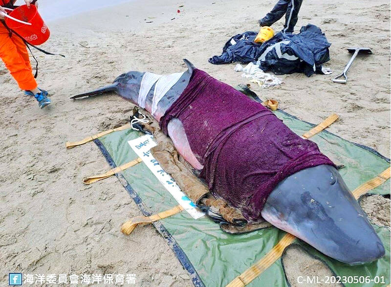 It showed signs of life when rescuers arrived to help resuscitate it on a beach in New Taipei City’s Wanli District (萬里).