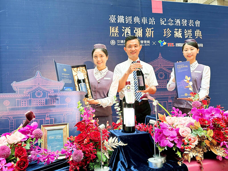 Taiwan Railways Administration (TRA) staff hold commemorative editions of Taiwan Tobacco and Liquor Corp liquor at an event in Taipei yesterday. The liquor, with its design themed on Kaohsiung Station, has been launched to celebrate the railway agency’s 136th anniversary this year, with preorders open to TRA employees today, then members of the public on Monday.
