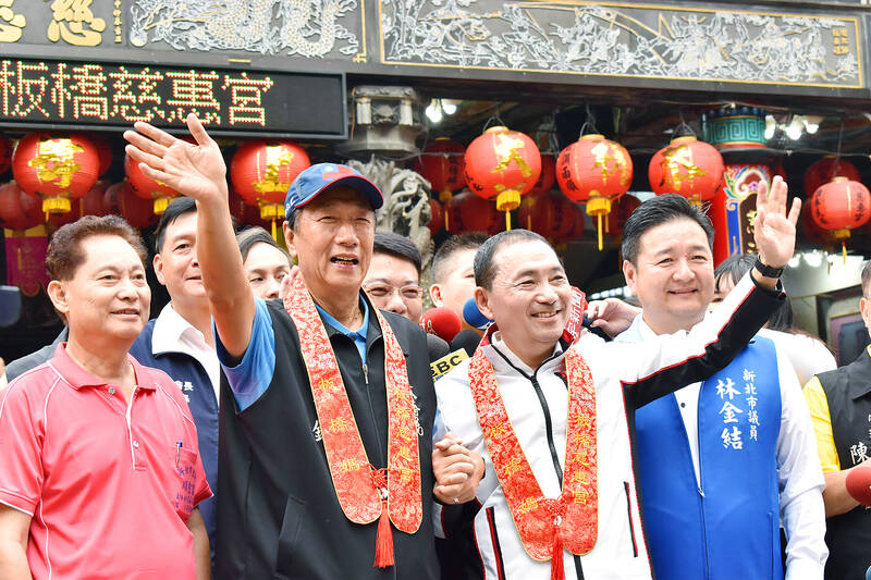 Hon Hai Precision Industry Co founder Terry Gou, second left, and New Taipei City Mayor Hou You-yi of the Chinese Nationalist Party (KMT), second right, wave during a visit to Cihui Temple in New Taipei City’s Banciao District yesterday to celebrate the birthday of the sea goddess Matsu. It also marked the first time the two presidential hopefuls shared a stage since Gou early last month announced his decision to seek the KMT’s nomination for candidacy in next year’s election.