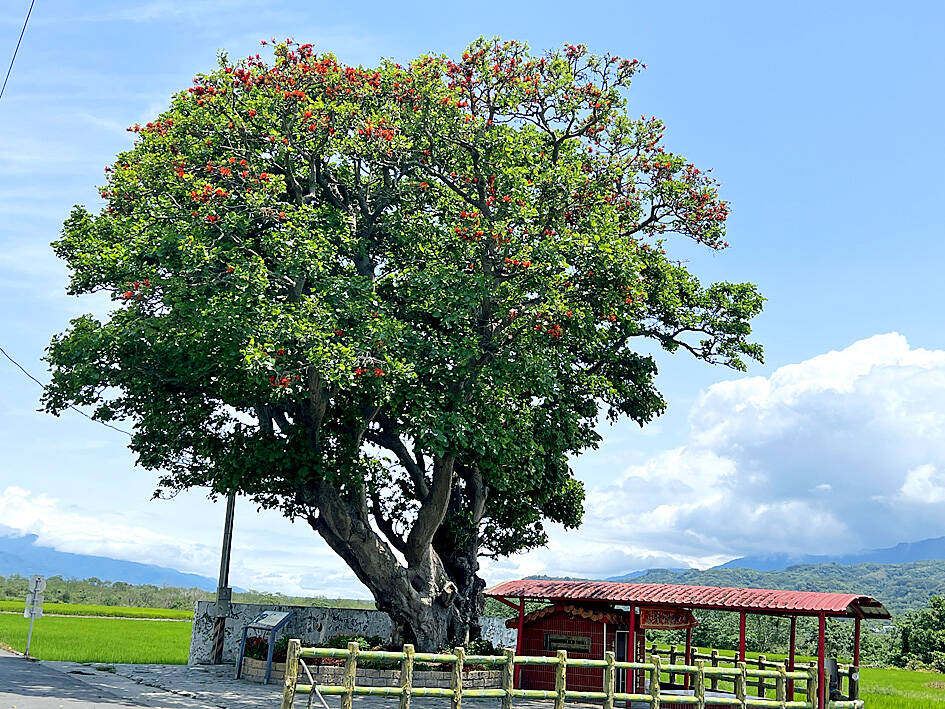 The “Rueihe 100-year tree” (瑞和百年莿桐樹, an Erythrina variegata, known in English as a tiger’s claw or Indian coral tree) — the only one of its kind that is protected by the Taitung County Government — stands next to a shrine in Luye Township’s (鹿野) Rueihe Village (瑞和).