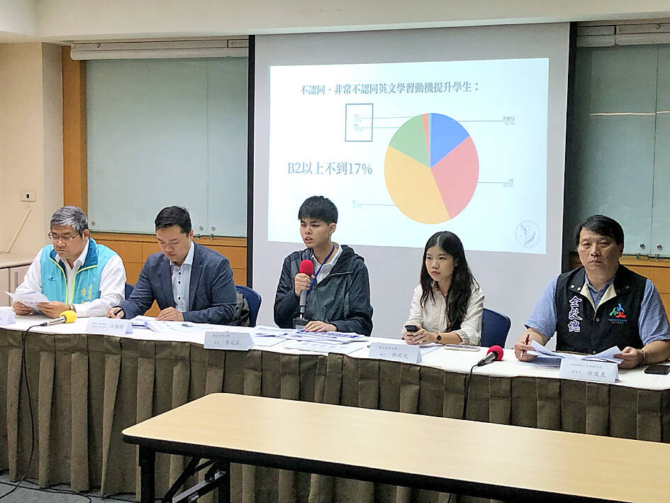 Announcing the results of the group’s survey, Lee told a news conference in Taipei that 57.5 percent of students do not find their English courses enjoyable or helpful.