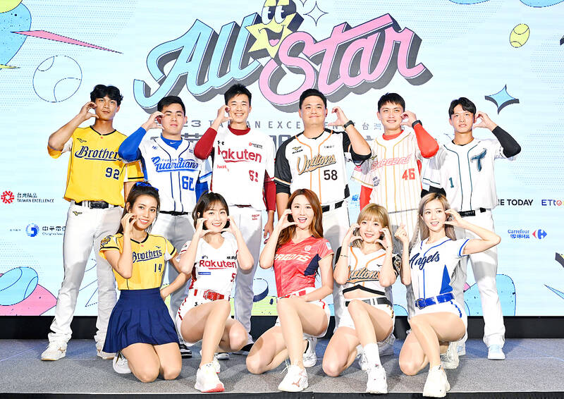 Each team’s star player, back row, and cheerleader, front row, for this year’s CPBL All-Star Game pose for a picture at a promotional event in Taipei yesterday. The game is to take place at the Taichung Intercontinental Baseball Stadium on July 29 and 30.