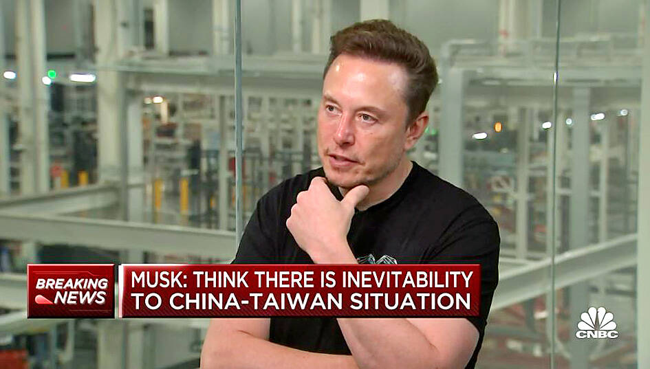 Asked in an interview with CNBC on Tuesday last week if “China would make a move to take control of Taiwan,” Musk said that “the official policy of China is that Taiwan should be integrated... One does not need to read between the lines.”