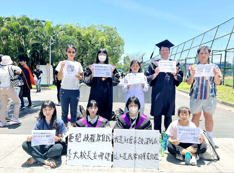 At NTU, department of sociology students protested to express their dissatisfaction with university president Chen Wen-chang (陳文章) for not receiving students in person on Friday to hear complaints related to incidents involving discriminatory remarks made by some students.