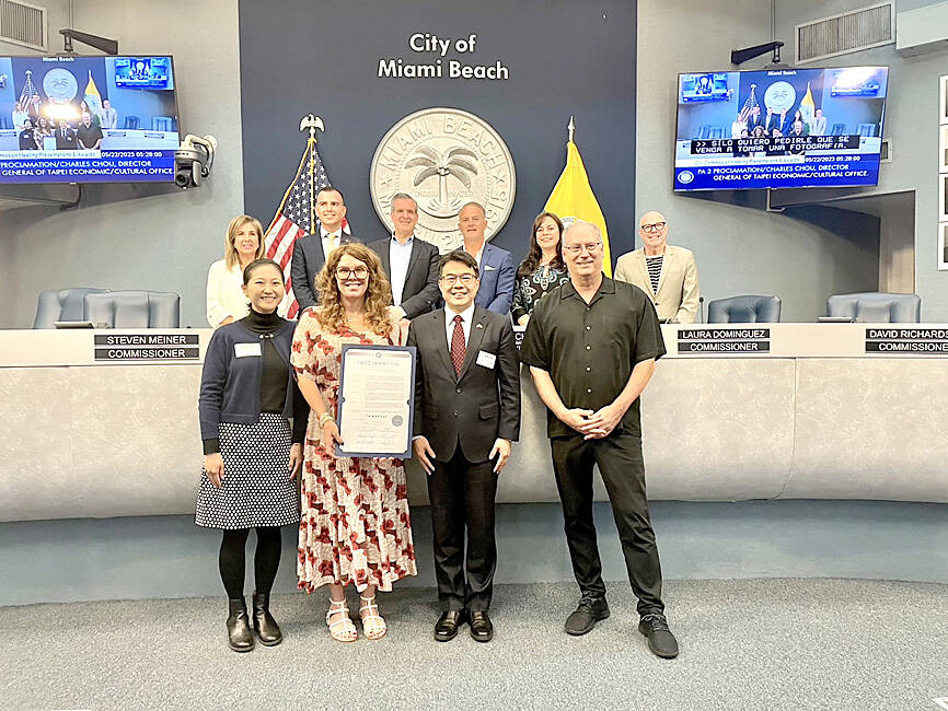 Miami Beach Mayor Dan Gelber presided over a meeting on Monday last week, during which Taipei Economic and Cultural Office in Miami Director General Chou (周啟宇) received the proclamation on behalf of the government.
