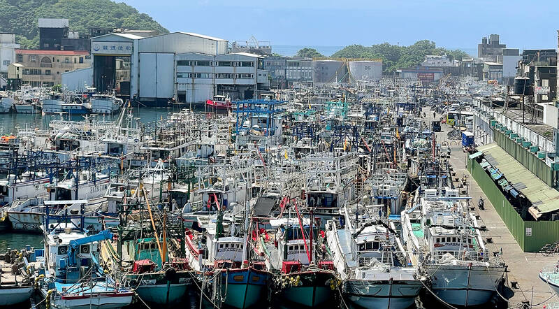 Fishing boats are moored at Yilan County’s Nanfangao yesterday for shelter as Typhoon Mawar approached the east coast of Taiwan. The Central Weather Bureau at 8:30pm issued a sea warning for the storm. Although the typhoon is not expected to make landfall in Taiwan, its periphery could bring torrential rain to northern, eastern and southeastern Taiwan, as well as mountainous areas in northern and central Taiwan until Thursday.