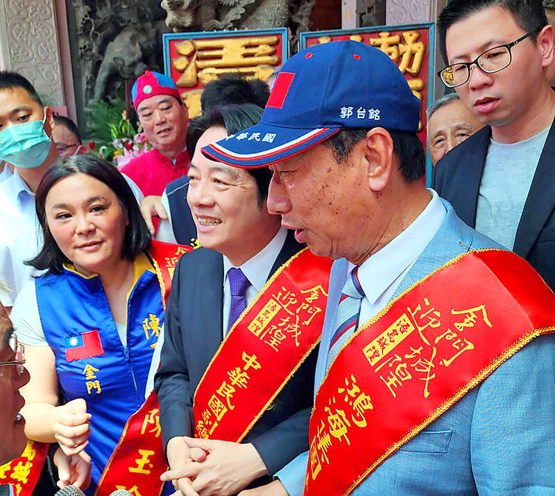 Lai, the Democratic Progressive Party’s presidential candidate, and Gou, a former Chinese Nationalist Party (KMT) hopeful, traveled to Kinmen to attend the Cheng Huang Festival, the county’s largest religious event.