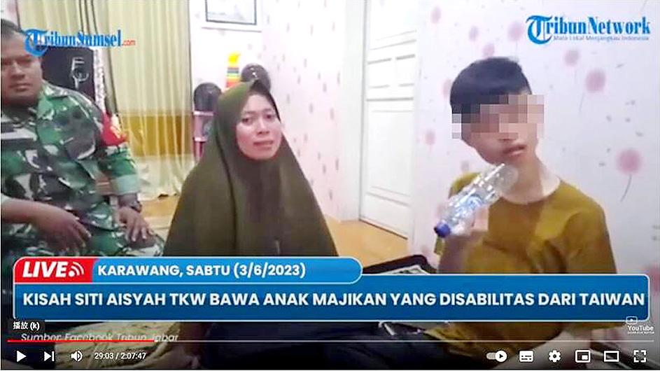 The Taipei Economic and Trade Office said that Siti Aisyah started to take care of a teenage boy surnamed Huang (黃), who has severe Down syndrome, after being hired by Huang’s father in 2013.