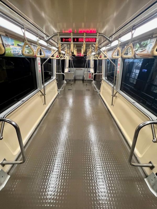 Taipei Rapid Transit Corp on Tuesday began trials of an updated interior design for the older VAL256 rolling stock, which removes the 12 seats from the center while keeping the eight priority seats at the ends.