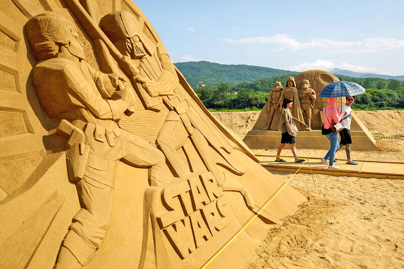 People walk past “Star Wars” sand sculptures at Fulong Beach in New Taipei City’s Gongliao District yesterday. This year’s sand sculpture exhibition features Disney characters made by international sand sculptors and is to run until Oct. 10.
